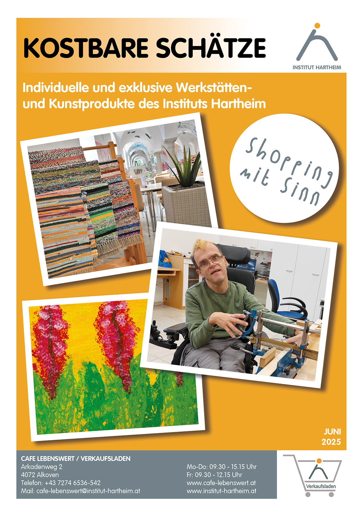 Direkt angeschlossen befindet sich unser liebevoll gestalteter Verkaufsladen, in dem handgefertigte Produkte aus den Werkstätten des Instituts Hartheim angeboten werden – darunter einzigartige Taschen, kunstvolle Kerzen, originelle Billets, charmante Vogelhäuser, kreative T-Shirts und dekorative Ziergegenstände.