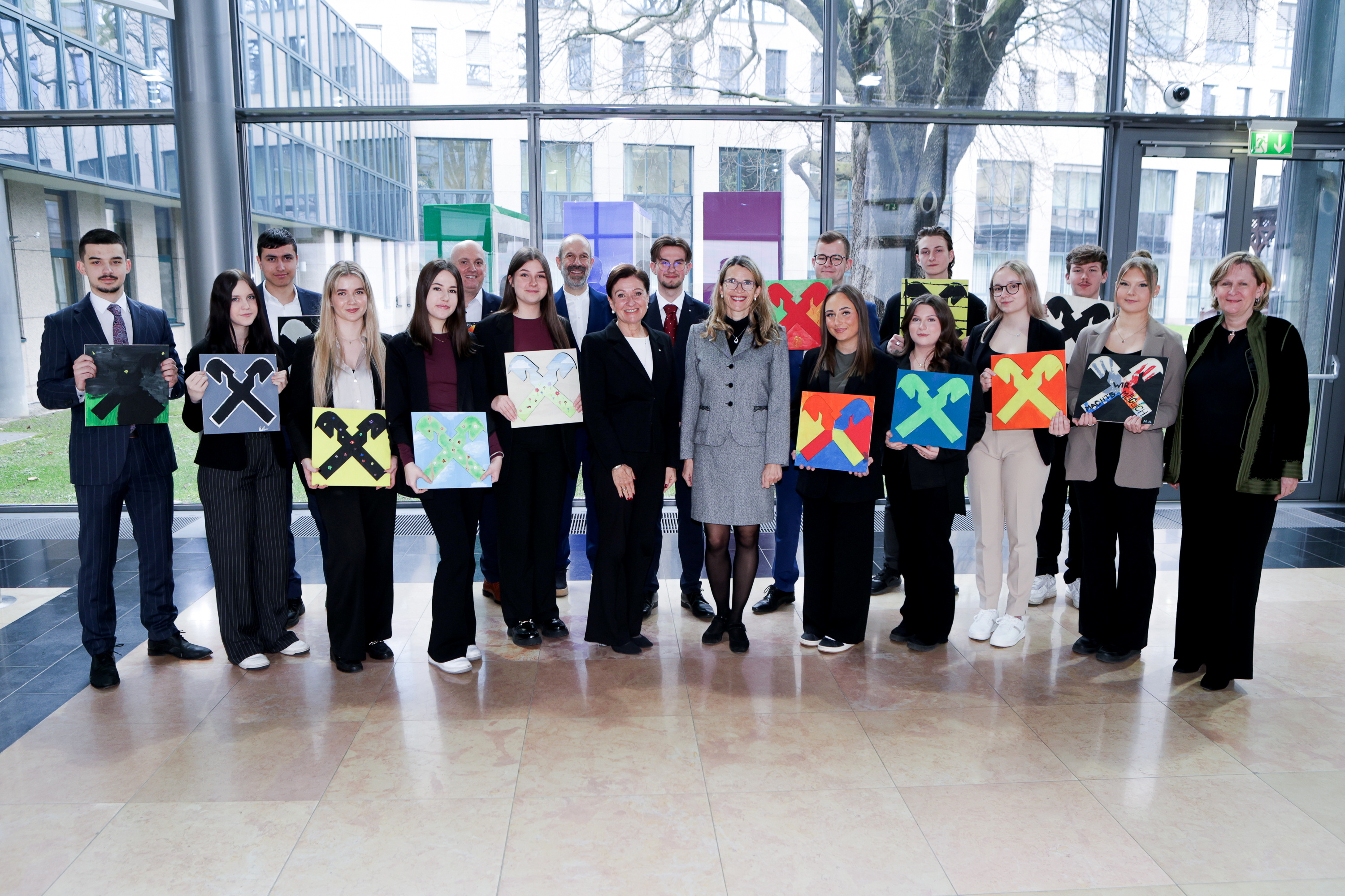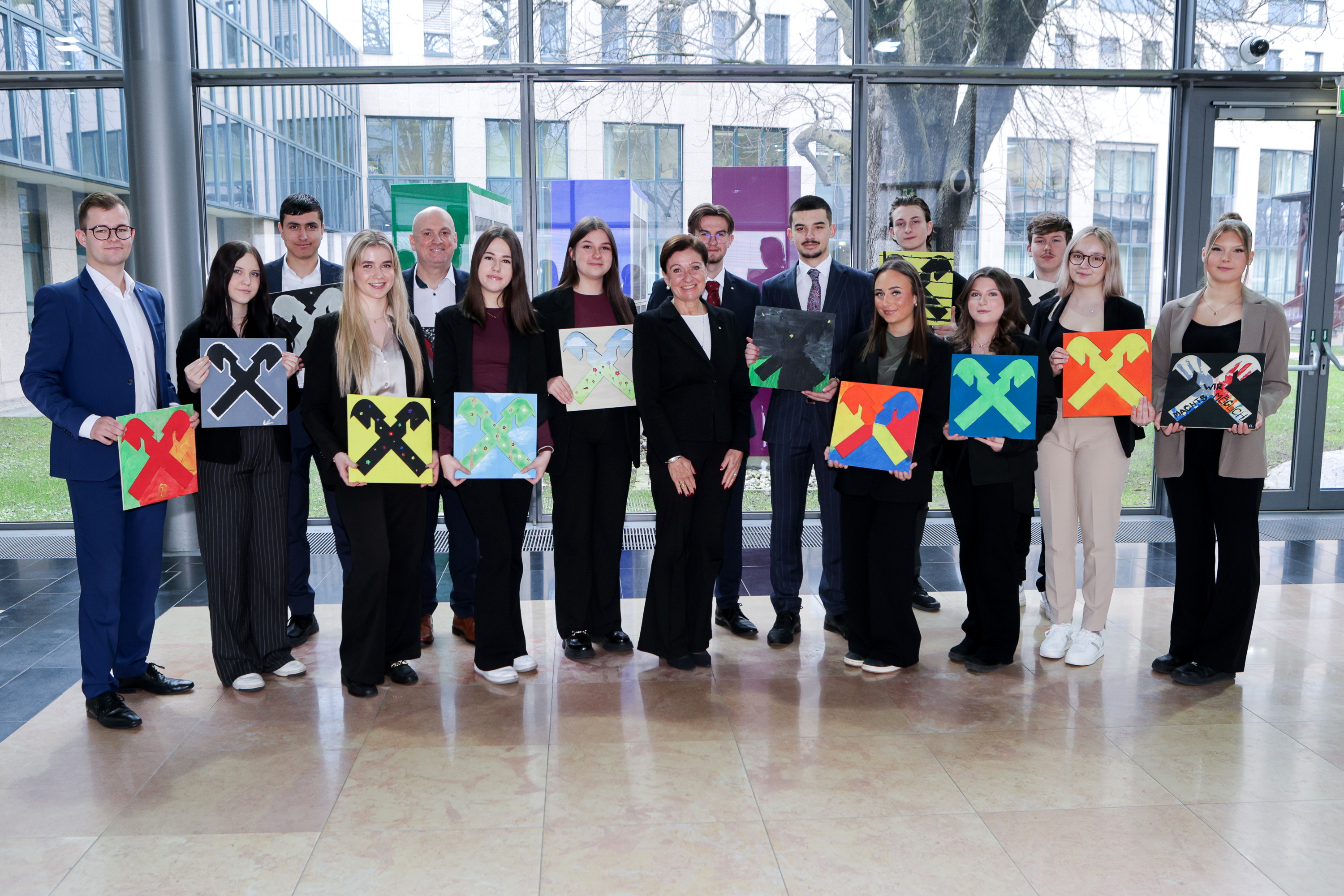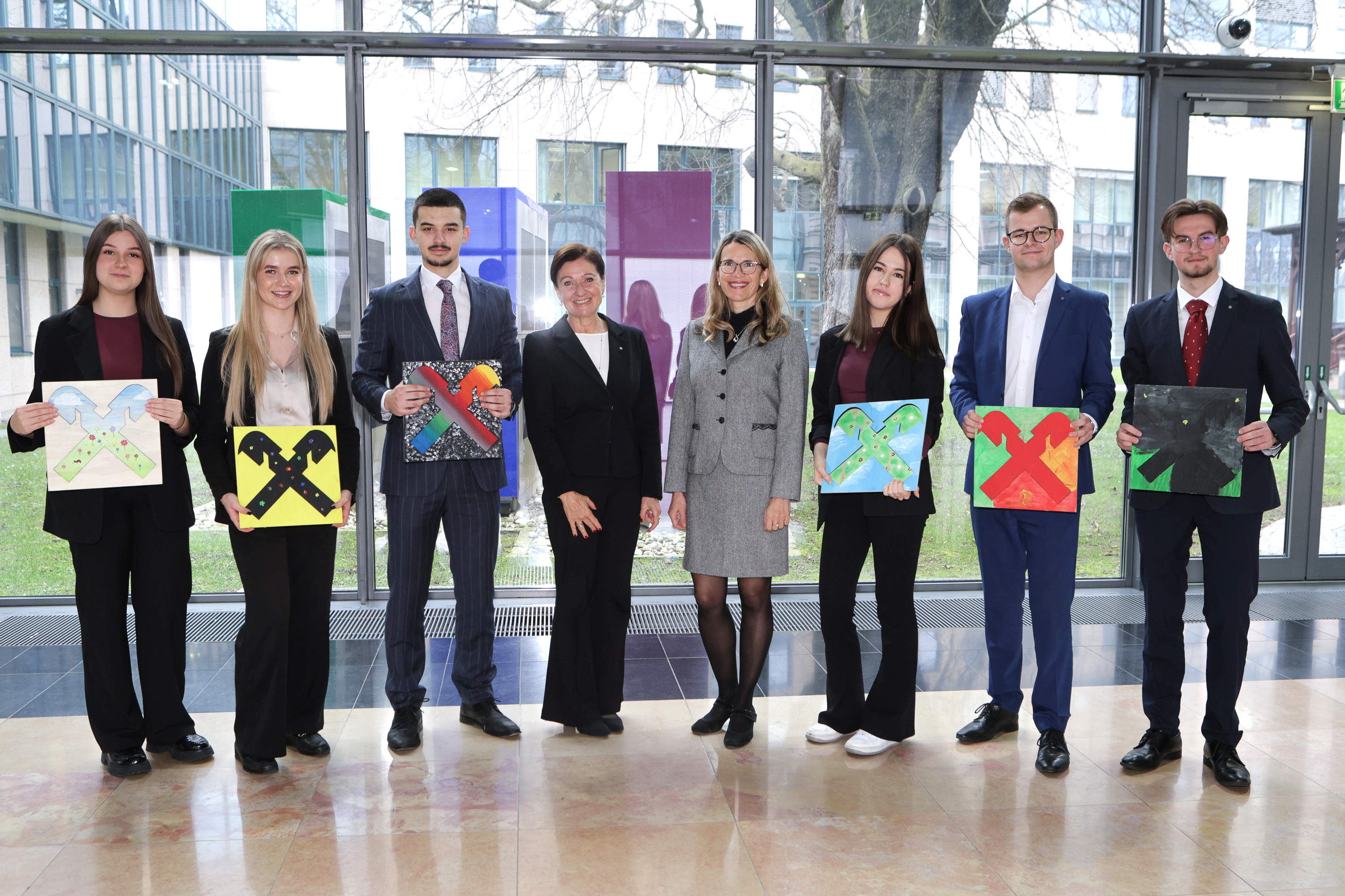 Im vergangenen Herbst durften wir zwei engagierte Lehrlingsgruppen der Raiffeisenlandesbank OÖ bei uns begrüßen. Gemeinsam mit den Beschäftigten in unseren Werkstätten entstanden dabei zwei kreative Projekte. Während die erste Gruppe gemeinsam mit Künstler:innen aus unserem Atelier und der Siebdruckerei bunte Variationen des Raiffeisen‑Logos gestaltete, widmete sich die zweite Gruppe in unserer Gärtnerei dem Binden von Adventkränzen mit persönlicher Note. Zum Abschluss dieses gelungenen Projekts fand nun ein gemeinsamer Fototermin mit den Lehrlingen in der RLB OÖ statt.